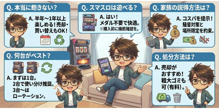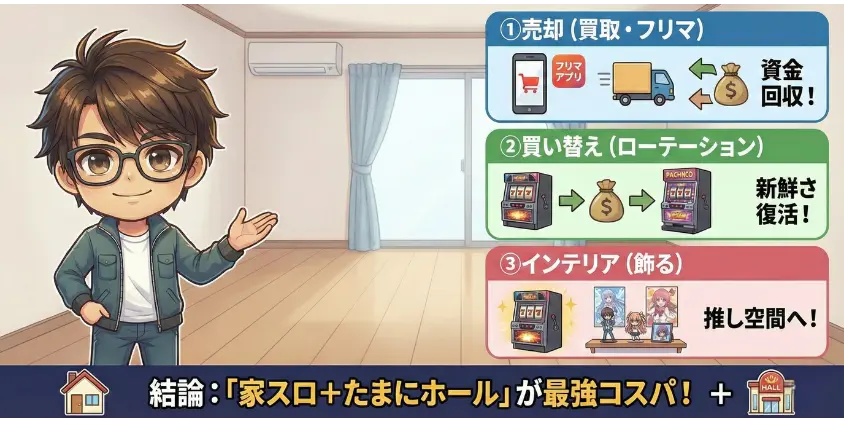 でも大丈夫です。家スロには「飽きた後」の選択肢がちゃんとあります。この出口戦略を知っておくだけで、「飽きたらどうしよう」という購入前の不安が大きく軽減されるはずです。