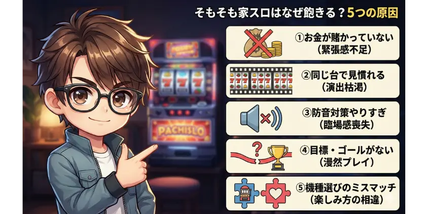 飽きない機種を選ぶ前に、まず「なぜ家スロは飽きるのか」を正しく理解しておきましょう。原因がわかれば、機種選びの判断基準が明確になります。