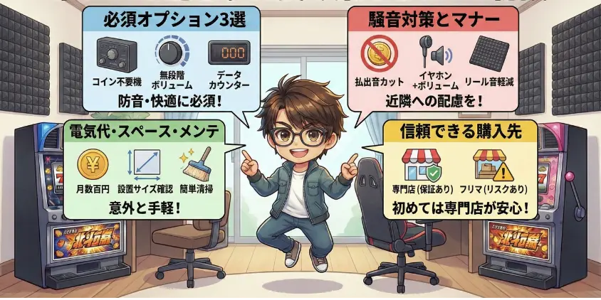 家スロを快適に楽しむために、最低限揃えておきたいオプションは以下の3つです。